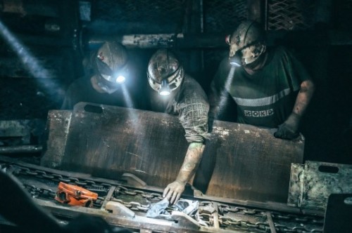 Horníci při opravě sběrného pancéře